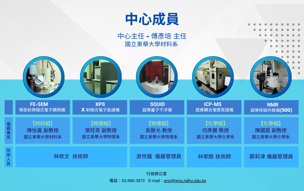 中心主任 / 計畫主持人 傅彥培 教授 115年2~7月由陳怡嘉副教授代理主任一職。執掌 :督導貴重儀器中心各項業務。擔任「基礎研究核心設施共同使用服務計畫」主持人,總理計畫之執行。電話:03-8903209E-mail : ypfu@gms.ndhu.edu.tw FE-SEM儀器專家 / 計畫共同主持人 陳怡嘉 副教授 執掌 :督責【熱場發射掃描式電子顯微鏡 FE-SEM】 儀器運作業務。擔任「基礎研究核心設施共同使用服務計畫」材料組共同主持人,協助計畫之執行。電話:03-8903227E-mail : yjchen@gms.ndhu.edu.tw XPS儀器專家 / 計畫共同主持人 葉旺奇 副教授 執掌 :督責【X光-光電子能光譜儀 XPS 】 儀器運作業務。擔任「基礎研究核心設施共同使用服務計畫」物理組共同主持人,協助計畫之執行。電話:03-8903719E-mail : wcy2@gms.ndhu.edu.tw SQUID儀器專家 / 計畫共同主持人 吳勝允 教授 執掌 :督責【超導量子干涉儀 SQUID】儀器業務運作。擔任「基礎研究核心設施共同使用服務計畫」物理組共同主持人,協助計畫之執行。電話:03-8903717E-mail : sywu@gms.ndhu.edu.tw NMR儀器專家 / 計畫共同主持人 陳國庭 副教授 執掌 :督責【核磁共振儀 NMR 500】儀器業務運作。擔任「基礎研究核心設施共同使用服務計畫」化學組共同主持人,協助計畫之執行。電話:03-8903603E-mail : ktchen26@gms.ndhu.edu.tw ICP-MS儀器專家 / 計畫共同主持人 何彥鵬 教授 執掌 :督責【感應偶和電漿質譜儀 ICP-MS】儀器業務運作。擔任「基礎研究核心設施共同使用服務計畫」化學組共同主持人,協助計畫之執行。電話:03-8903591E-mail : ypho@gms.ndhu.edu.tw 中心行政辦公室 電話:03-8903972E-mail : erin@gms.ndhu.edu.tw 核心設施實驗室 電話:03-8903973E-mail : brucelin@gms.ndhu.edu.tw